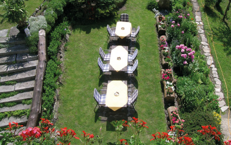 Der liebevoll gepflegte Garten ist vom Frühjahr bis Ende Herbst Treffpunkt für unsere Gäste. Inmitten von Wiesen, der Aussicht zu den ersten 3000er Gipfeln des Tales, von Vogelgezwitscher und Grillenzirpen und dem Rauschen des Stuibenwasserfalls finden Sie zur Ruhe.